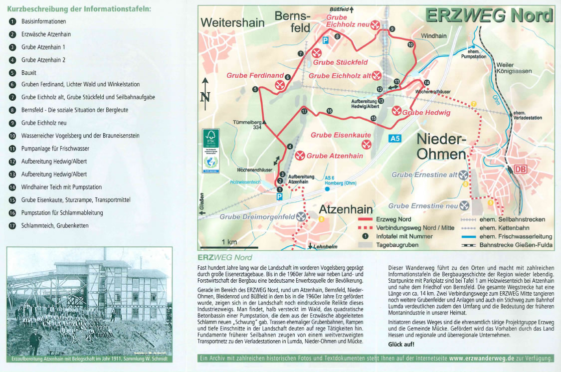 Länge: Etwa 14 km Zeit: Mit sachkundiger Führung oder Lesen aller Schilder etwa 5 Std Einstiegspunkt: 35325 Mücke/Atzenhain, Holzwiesenteich (GoogleMap: Parkplatz Erzweg Nord) Fertigstellung: Im Jahr 2022 Besondertheit: Strecke beinhaltet tolle Aussichtsplätze Sonstiges: Informationen über Bauxitvorkommen Bilder:Bild-Impressionen der Wanderwege Führungen: Termine befinden sich auf der Startseite unter dem Punkt Termine. Oder auf Anfrage für Gruppen ab 6 Personen. Navigation: Bei folgenden Anbietern haben Sie die Möglichkeit ihre Route vorher anzusehen, auszudrucken oder sich direkt über Ihr Handy navigieren zu lassen